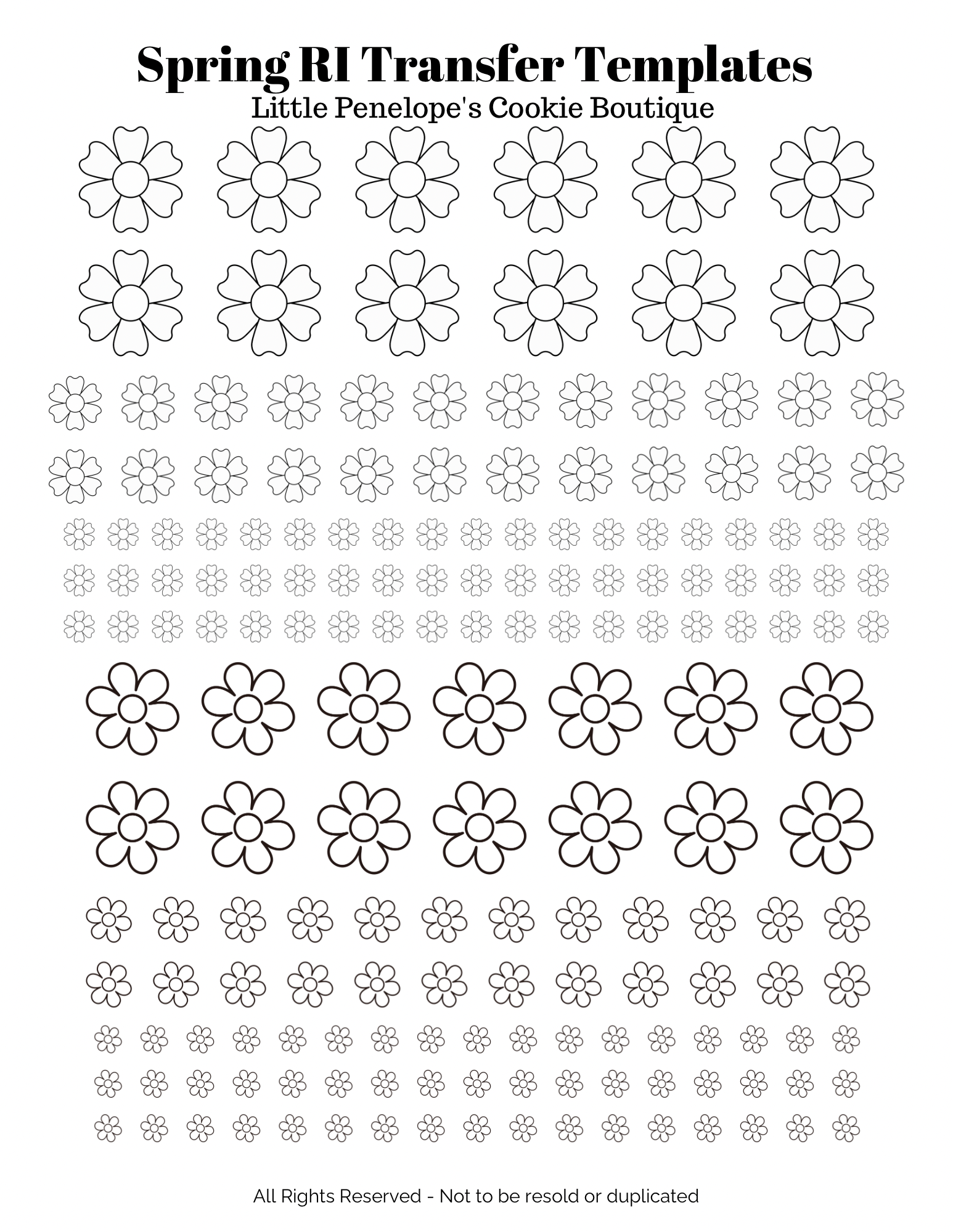 These Royal Icing Transfer Sheet Templates are for personal and commercial use, subject to the following conditions. You may use the templates to create products for sale, but the templates themselves may not be resold, redistributed, or shared in any form (digital or physical). All rights to the templates remain with Little Penelope’s Cookie Boutique. By purchasing and downloading, you agree to adhere to these terms.